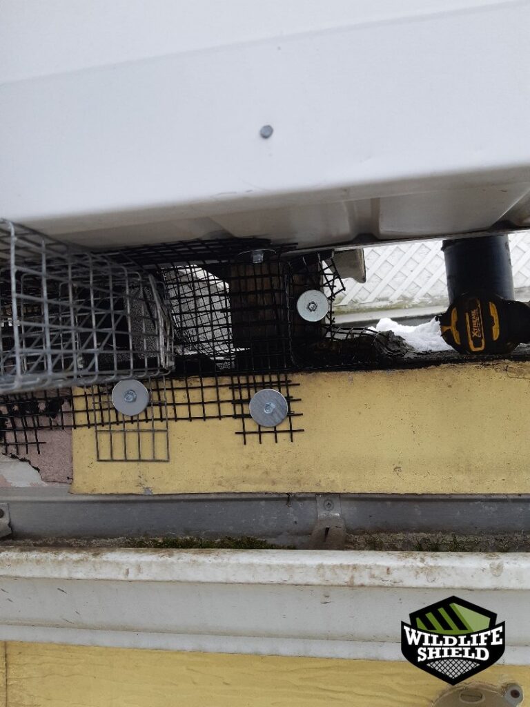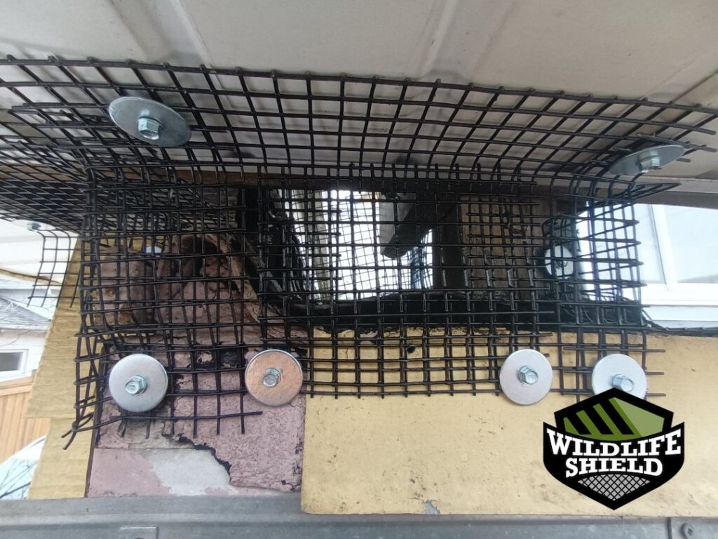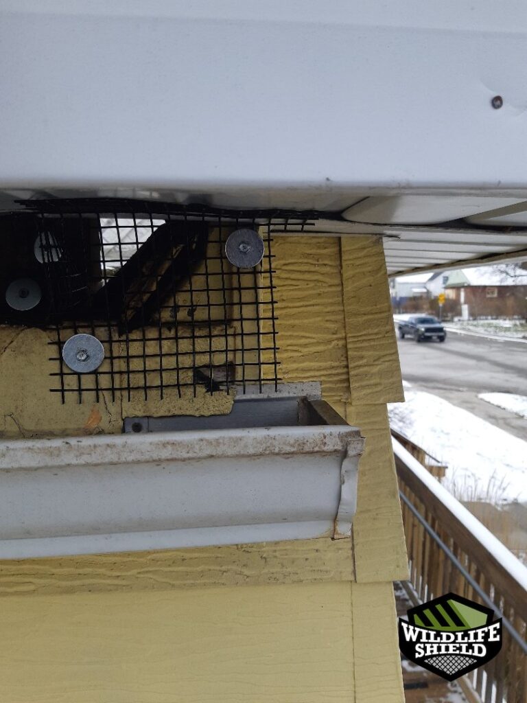 While a full exclusion package was declined, localized screening was installed at the active entry points to support the one-way door setup and protect the surrounding openings during the removal period. Photos show wire screening secured along soffit and wall vent areas where access had been observed.