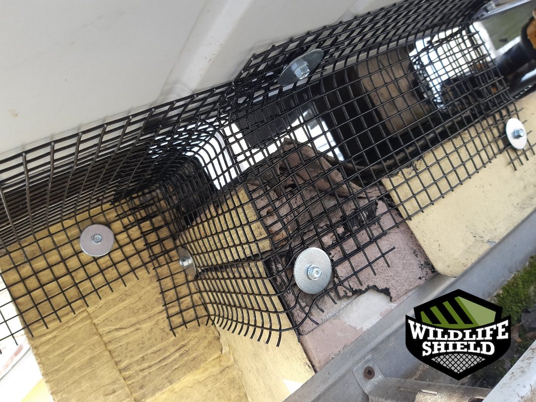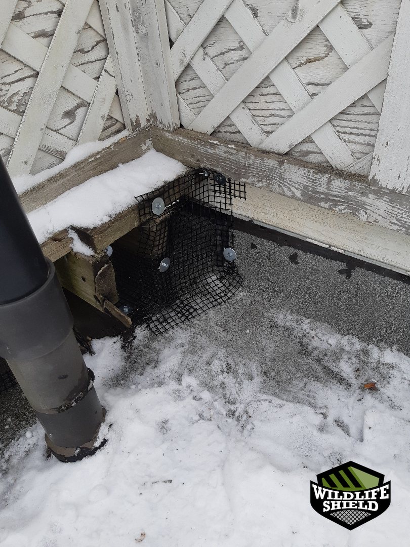 While a full exclusion package was declined, localized screening was installed at the active entry points to support the one-way door setup and protect the surrounding openings during the removal period. Photos show wire screening secured along soffit and wall vent areas where access had been observed.